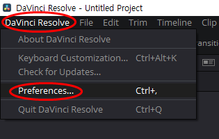 ↑ 프로그램 좌측 상단에 있는 "DaVinci Resolve" 메뉴 선택 후