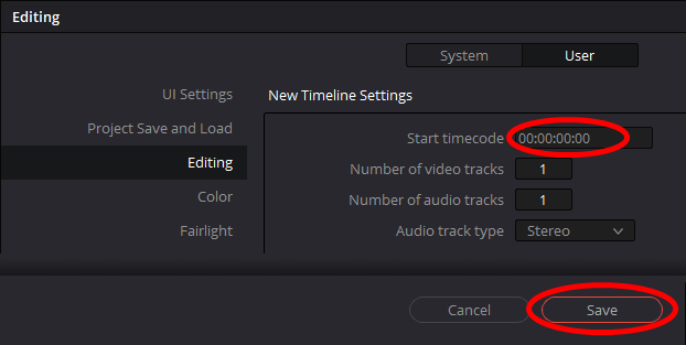 3. "Start timecode"가 "01:00:00:00"으로 되어있으면