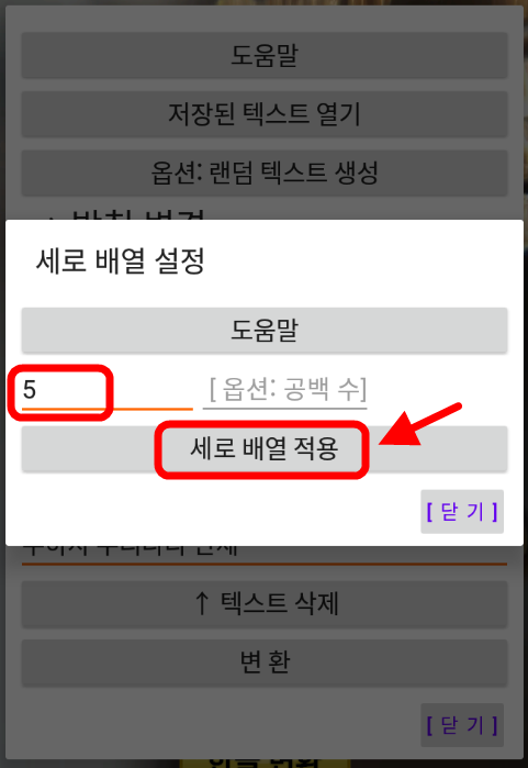 만약 5를 입력하면 세로로 배열되는 결과 텍스트가 총 5개의 줄로 이루어진 텍스트로 변환됩니다.