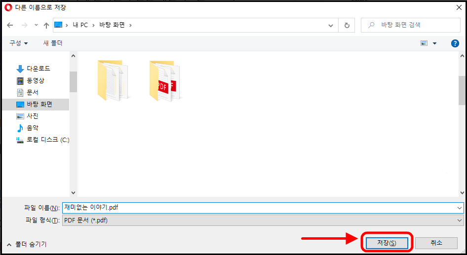 ↑ PDF 파일을 저장할 위치와 이름을 정하고 나서 "저장" 버튼을 누르고 저장합니다.