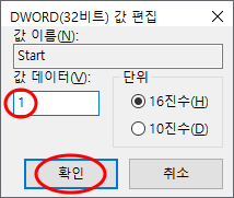 Start 항목의 데이터가 1로 잘 변경됐는지 확인하고 재부팅합니다.