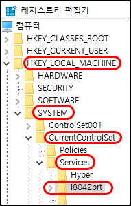 HKEY_LOCAL_MACHINE → SYSTEM → CurrentControlSet → Services → i8042prt 클릭
